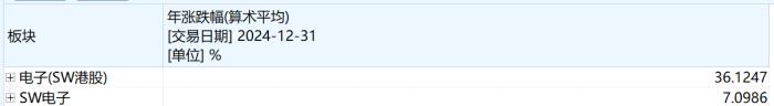 该趋势在港股阛阓中体现得尤为凸起。SW电子指数2024年全年涨幅达7%,而SW港股电子指数更是达成了36%的惊东说念主涨幅。